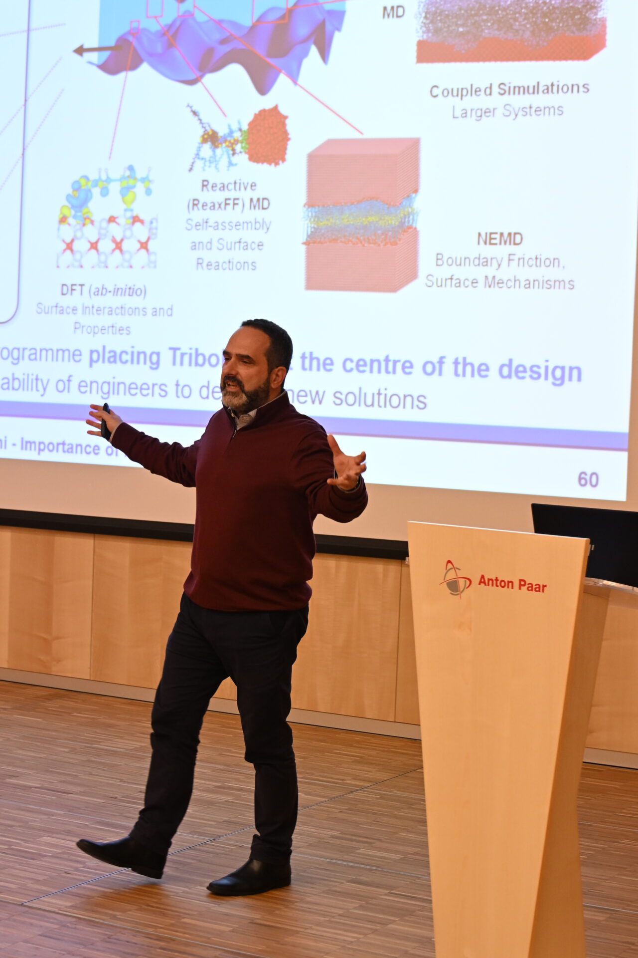 It will start with an overview of the modelling tools developed to study interfacial and rheological phenomena across the scales, and will then move onto demonstrating how in-silico experiments can be used to shed light on physical, chemical and mechanical phenomena that affect frictional interactions and engineering performance in several applications in the energy sector, including electric vehicles (EVs) and triboelectric nanogenerators (TENGs), biomedical applications, consumer goods, and functionalized and hierarchical materials and surfaces.